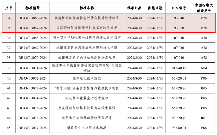 11月30日,由湖南省交通規劃勘察設計院有限公司主編的省級地方標準《既有橋梁防船撞性能評估與提升設計標準》(DB43/T 3066-2024)《公路鋼波紋板橋涵設計施工與驗收規范》(DB43/T 3067-2024)正式實施,其中《既有橋梁防船撞性能評估與提升設計標準》填補了國內該領域空白。此外,交通設計院主編的《公路橋梁預應力混凝土管樁應用技術規程》(DB43/T 3085-2024)2025年2月13日起實施,為我省交通基礎設施建設提供有力的技術支撐。
