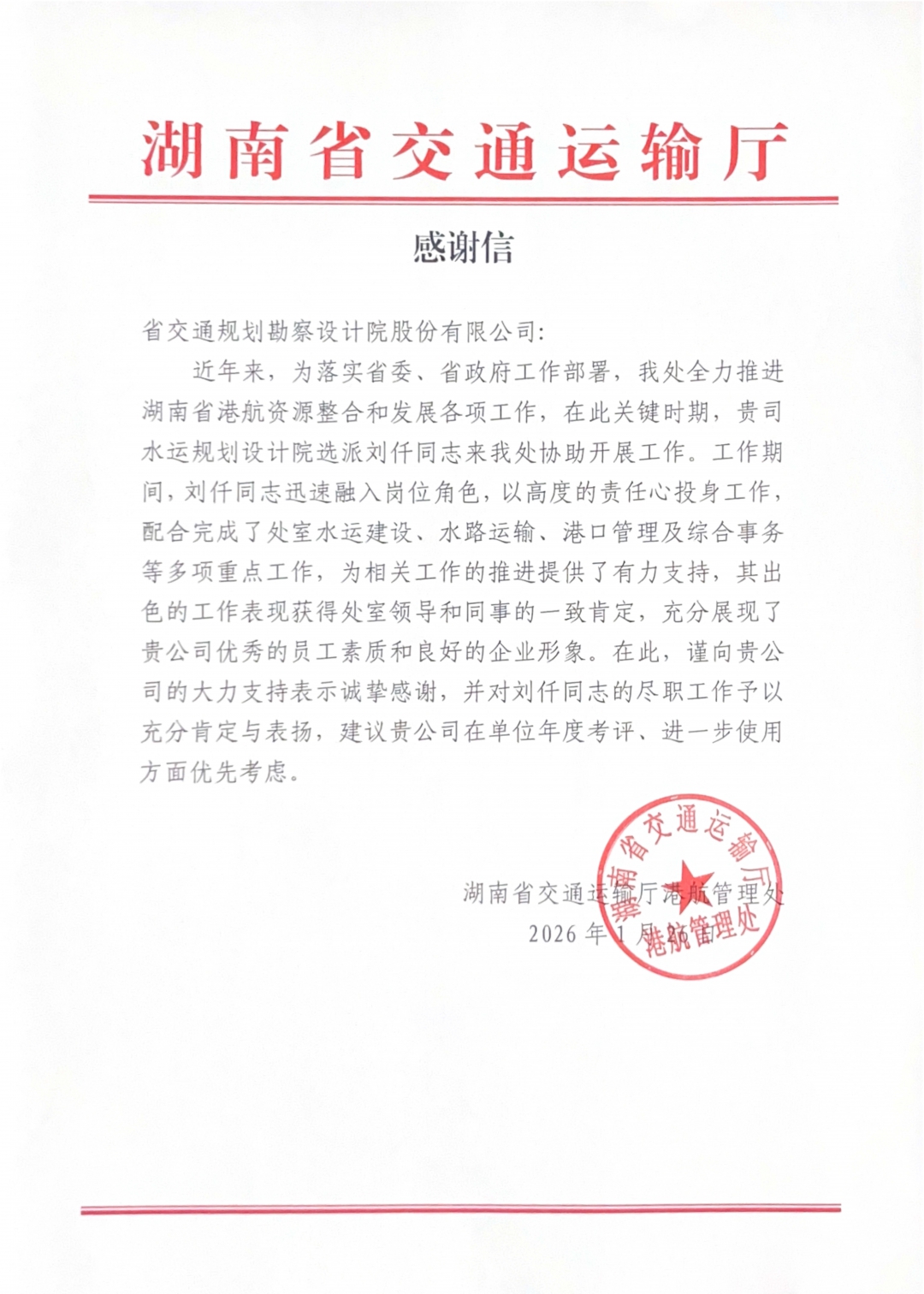 編者按:歲末年初,捷報頻傳。近日,湖南交通設計院接連收到多封感謝信與表揚信,體現了各方對公司技術水平、服務態度、響應效率、敬業精神的高度認可。湖南交通設計院將以此為激勵,持續踐行“注重細節、追求卓越、打造精品”的質量理念與“加強溝通、高質高效、顧客滿意”的服務理...