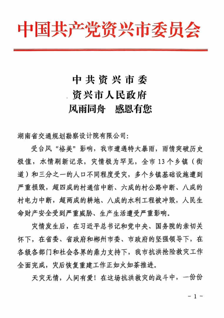 近日,中共資興市委、資興市人民政府發來感謝信,信中高度評價了湖南省交通規劃勘察設計院有限公司在馳援資興搶險救災及災后恢復重建工作中展現的擔當精神和技術水平,對公司作出的積極貢獻表達了誠摯的感謝。信中指出,資興市此次遭遇災情極為罕見,多地基礎設施遭到嚴重損毀、大范...