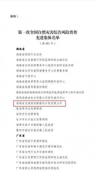 湖南交通設計院榮獲“全國自然災害綜合風險普查先進集體”稱號