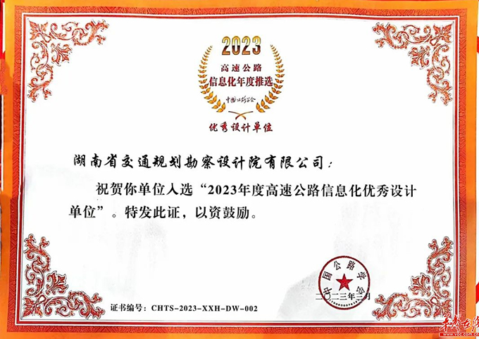 湖南日?qǐng)?bào)·華聲在線4月21日訊(通訊員 薛新風(fēng))近日,第25屆中國(guó)高速公路信息化大會(huì)暨技術(shù)產(chǎn)品博覽會(huì)在福州舉辦。大會(huì)舉行了“2023高速公路信息化年度推選活動(dòng)”揭曉典禮。這是當(dāng)前我國(guó)交通信息化領(lǐng)域最高榮譽(yù)的獎(jiǎng)項(xiàng)評(píng)選,湖南建投交通設(shè)計(jì)院獲“優(yōu)秀設(shè)計(jì)單位”表彰,是本次評(píng)選中湖南省唯一獲該類別榮譽(yù)的企業(yè)。